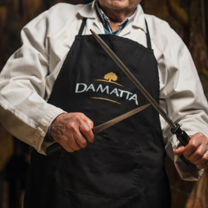 Fatiado à mão pelos nossos mestres de corte de presunto Damatta. A singular e requintada intensidade degustativa do presunto, no melhor ponto de cura aos 14 meses, converte-o num produto de excelência, com uma versatilidade infinita de acompanhamento na sua degustação.